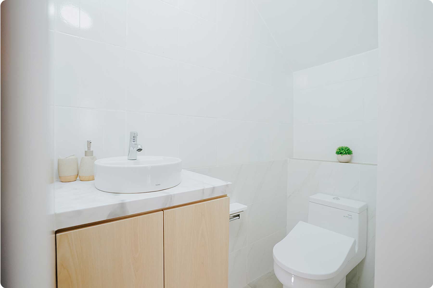 Dinding: Keramik motif elegan 30x60 cm hingga plafon.